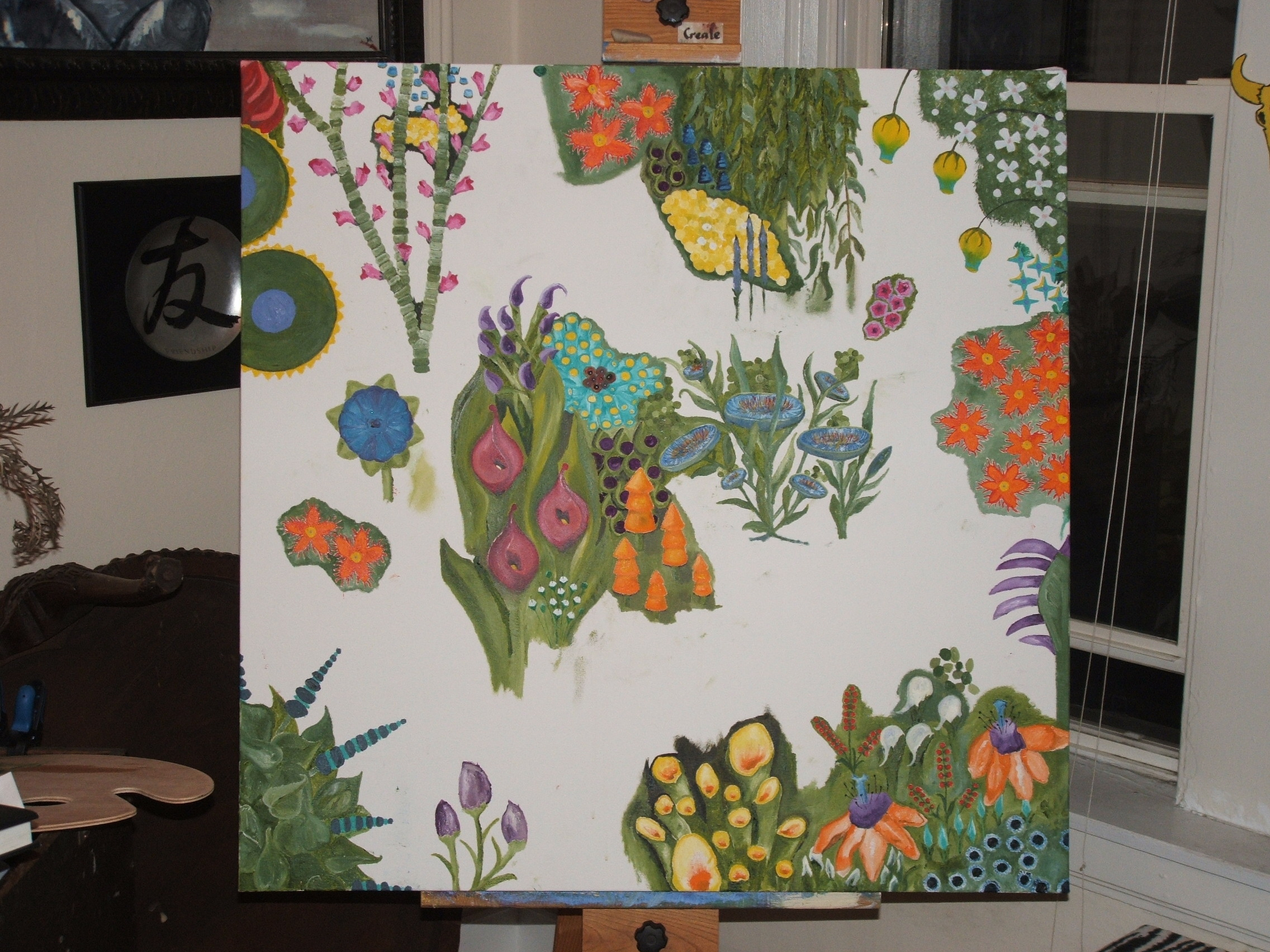 So… I sit and stare at it… ponder what needs to be done… what flower, what color… Then, I give a big thoughtful sigh and turn off the lights.. walking into the bedroom while the painting yells at me,” you come back here, don’t you walk away from me like that, listen here I hav….” and I shut the door… I need to find my muse again…