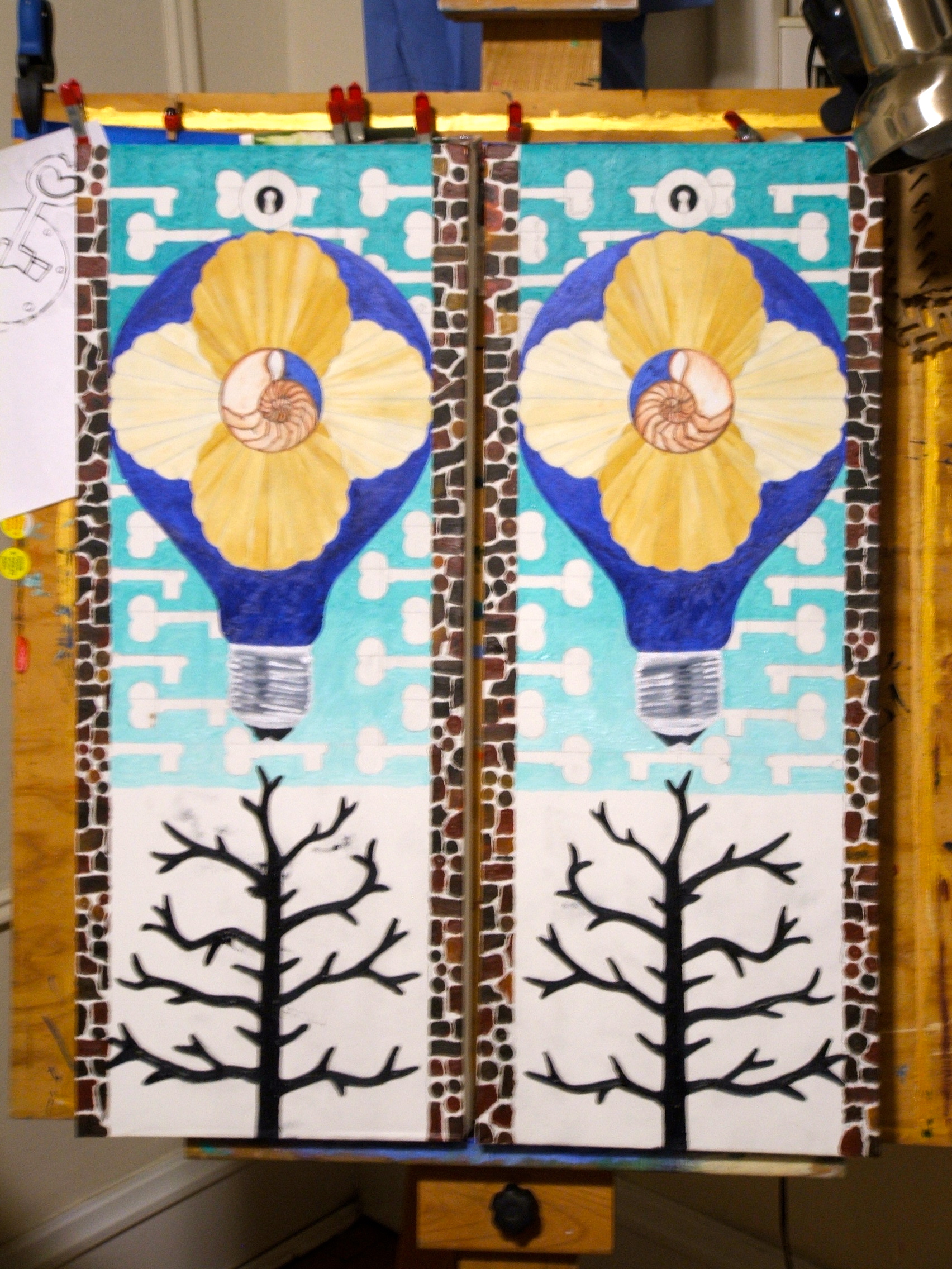 I was looking over some of images from each phase of the painting and was able to see a pattern in how I move forward in a piece. I learn something interesting about my own creative process. As a general rule I prefer working in a larger scale. But the manner that I approach a piece is by breaking it down into smaller components and working on each individual part. Then when all of the elements are connected… the piece becomes one. Which seems very simple, but in the moment it informed me of my creative process differently. So it will be interesting to see how this painting will change with my new insight.