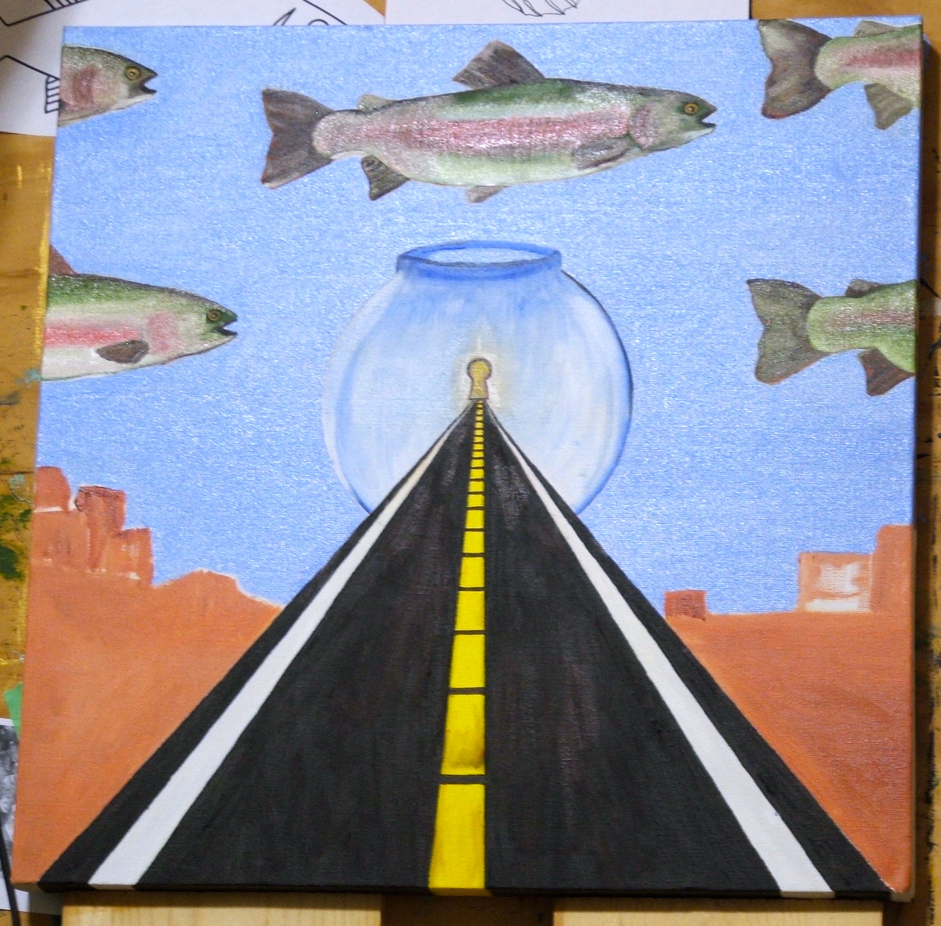 The cool rainy weather is not working in my favor lately during “studio time” as it is not conducive for oil paint to dry. So as I work on this piece I have experienced moments of working effortlessly for hours and then days go by and I sit in the chair across from the easel watching it…almost as if I am waiting for the moment when the central fish turns his face to me and starts talking. I am certain that there are great insights he wishes to share with me, maybe even some ideas of how this painting will move forward. I sit and wait…attentively.