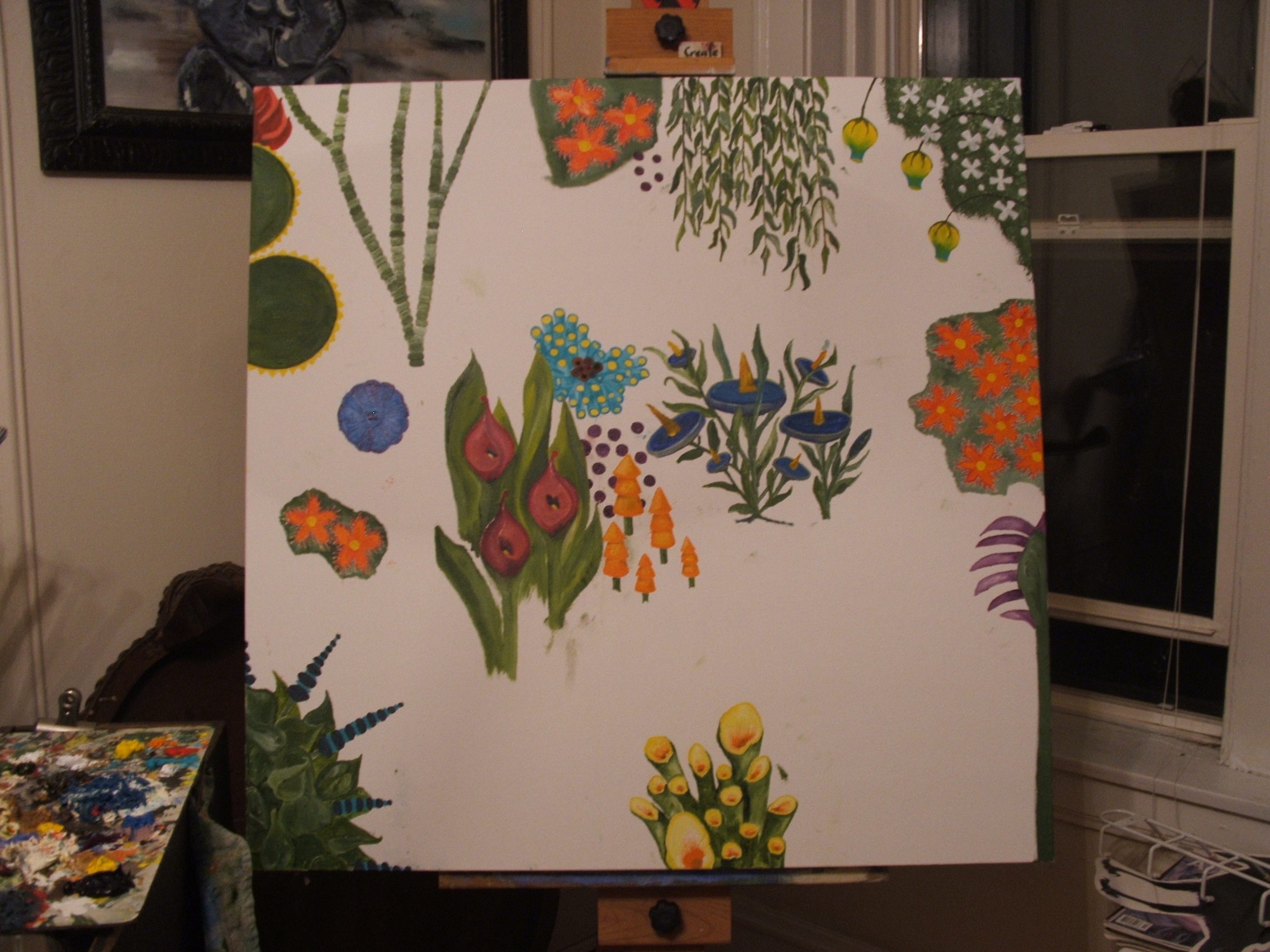The time has arrived for me to share with you what I have been working on in the studio, for the last couple of months. The canvas is 36 x 36 with a 2 ¼ profile. I have been working mostly with a #1 and #00 brush to make the details very hyper-surreal. When this is finished there will be no white visible unless it is used in a flower. The inspiration of this piece is “Mutant Flowers” posted on the gallery page under paintings.
