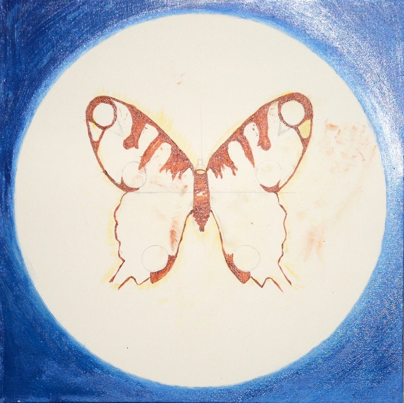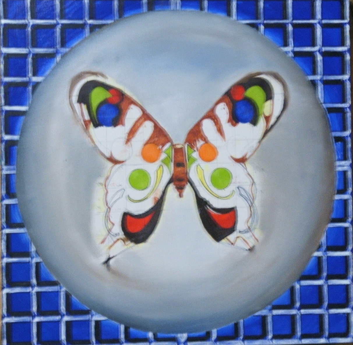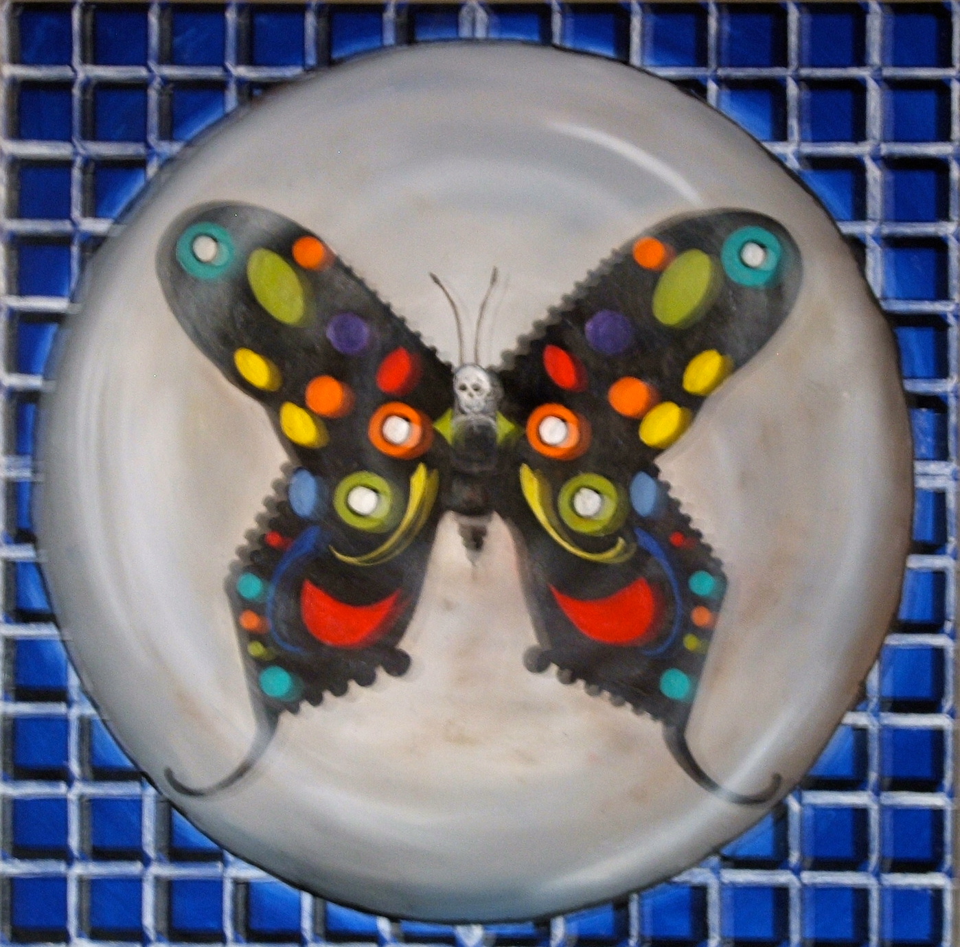 The painting’s main subject is a brightly marked butterfly that is trapped [protected] within a bubble and in the background there is an iron grid. The beauty of the butterfly is protected by the bubble and then even more so by the iron grid in the background. If one looks closely the body of the butterfly has been replace by a human skeleton.