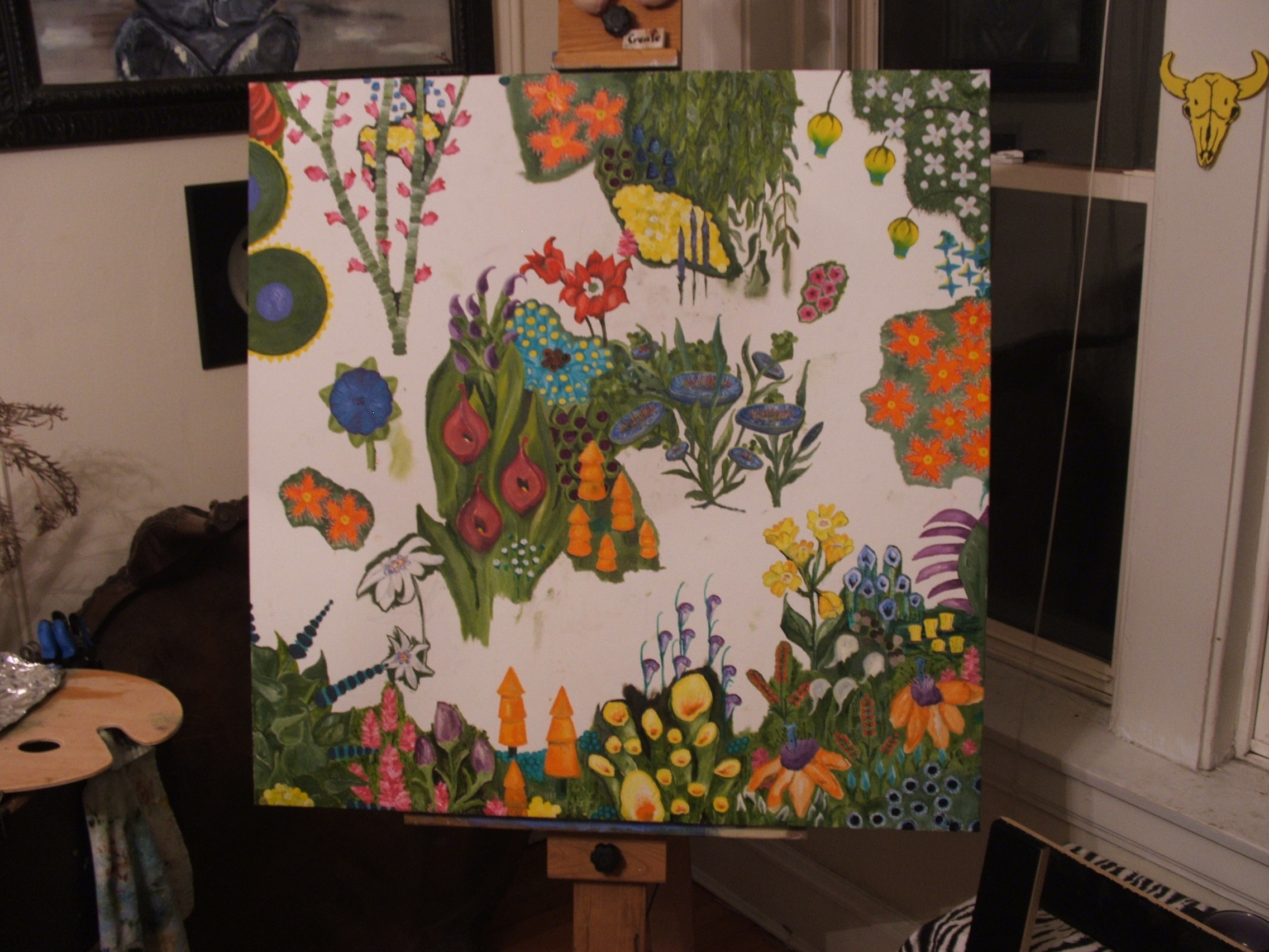 As time goes on there is less and less white canvas showing…three more weeks till the deadline to finish and sign this piece… looks like this one will dry while it hangs on the wall lol…